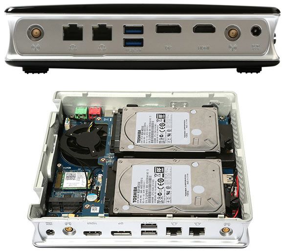 As we can see from the table, two novelties are equipped with two slots for DDR3 SO-DIMM with up to 1600 MHz (the total amount of RAM should not exceed 16 GB), video output HDMI 1.4a and DisplayPort 1.2, four ports USB 3.0, port COM, two audio jacks , card reader SD / SDHC / SDXC, two Gigabit Ethernet connectors as well as a wireless adapter WiFi + Bluetooth.