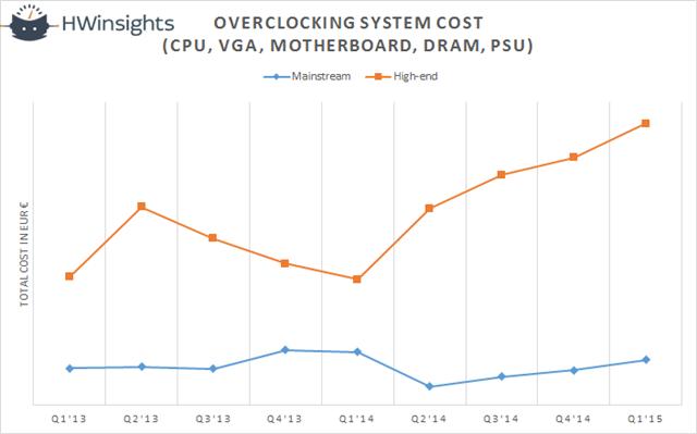 While the bulk of people are sitting on hardware 2-3 generations ago, a user is interested in improving the system overclock update with each new generation of components. Typical cost of buying a PC "mass" class is estimated at $ 500. Gaming PC worth an average of $ 1,000, with the beginnings of a system for overclocking is already at $ 1175 (1050 euros). During the quarter, the cost of younger systems for overclock rose by 70 euros, while the price of higher overclocking level for the same period increased from 2385 euros to 2610 euros.