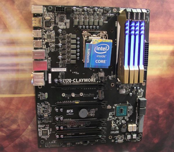 Z170 Claymore is based on the chipset and Intel Z170 processor to provide power on it implemented 12 phase converter. The rest of the functionality is represented by four slots DDR4, five slots PEG (PCI-Express Graphics; version PCI-E 3.0, the top three are connected to the processor controller PCI-E and can operate as a 16 + 0 + 0/8 + 8 + 0/8 + 4 4, supports SLI dual-card NVidia, bottom two are connected to the Z170 and physically are PCI-E 2.0 x4), four SATA3, one SATAe , one M.2 NGFF (apparently is connected to the Z170 through two or four lines PCI-E 2.0), two USB 3.1, six USB 3.0, Gigabit Ethernet .