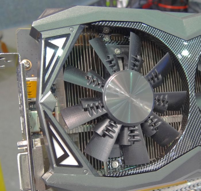 Secondly, both cards use fans EKO Fans with unusual shape of the impeller. Like other manufacturers of video cards , ZOTAC claims that forked blade allows better control of the effect of dead zone the center of the fan, where the conditions of air circulation is worse than at the periphery. In the case of fans ZOTAC we can talk about increasing the air flow by 30%,. The pressure increased by 15%.