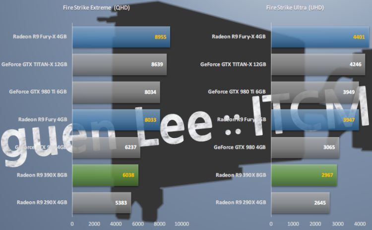 Let's start with the fact that running resolutions Radeon R9 Fury X series tests 3DMark Fire Strike shows itself very worthy, ahead of much more expensive video card GeForce GTX Titan X, and significantly outperforming the equal in price GeForce GTX 980 Ti. Along the way, you can estimate what effect is given Radeon R9 390X increase memory capacity up to 8 GB and the accompanying increase in frequency.