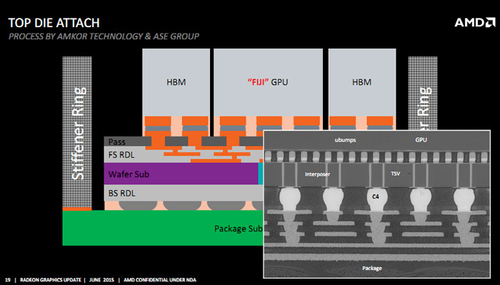 In some ways a step backward.  Memory and GPU performance in Fiji is a multi-chip package, which at the present stage of production reached more impressive results than those we demonstrated with AMD company partners.  The company Samsung, for example, easily packs into three separate chip stack processor, DRAM, and NAND-flash.  However, in the case of Fiji & HBM created a high-tech bridge with through-substrate (TSVs) compounds itself is conditional crystal.
