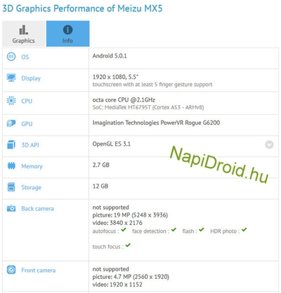 According to information GFXBench, Meizu install smartphone MX5 5.5-inch Full HD display and a single-chip platform MediaTek MT6793, also known as Helio X10, with 2.1-gigahertz processor and eight-core graphics PowerVR G6200.  The memory volume is 3 GB, but the capacity of the built-in storage - 16 GB, from which the user will be available  12 GB.  Also referred to the existence of two chambers:  main 20-megapixel with video recording with a resolution of 2160p and a 5-megapixel front that can shoot Full HD video.  The operating system will perform preset Android 5.0.1 Lollipop.