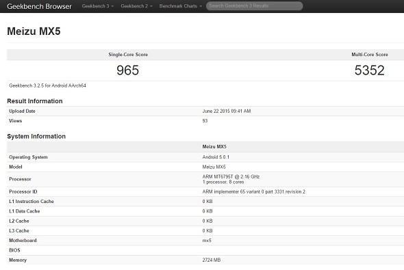 According to GSMArena, Meizu MX5 based on MediaTek MT6793 in the Geekbench benchmark scored 965 points in the single core test, and 5352 points in multi-core mode.