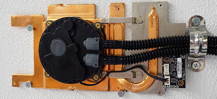 For the first time to the public was presented the water block hidden behind a mesh cover. Copper base water block covers the memory chips and the additional section in contact with the power components, connected to the base with a heat pipe.