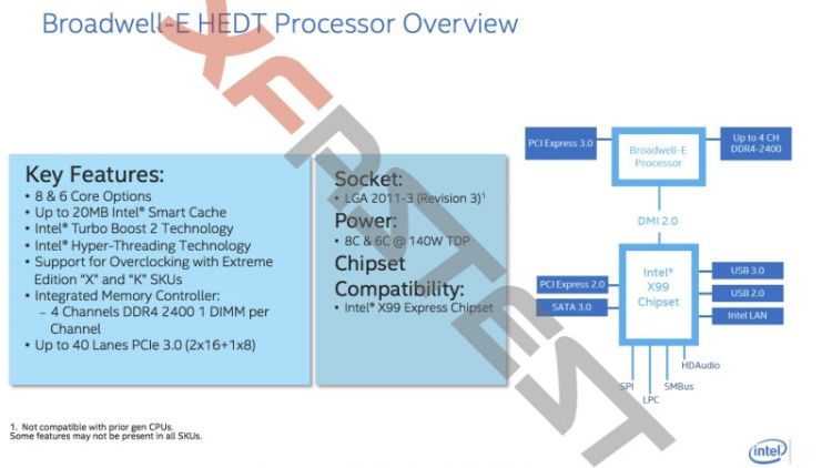 Processors Broadwell-E, will have up to eight cores with support for four-channel memory type DDR4-2400, cache capacity in the individual models will reach 20 MB, and the value TDP will not exceed 140 watts.