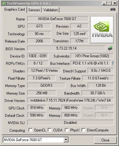 11,167 3DMark05 score is the best result for the GeForce 7600 GT. The card is equipped with 90nm G73 graphics processor and 256 MB of GDDR3 memory with 128-bit bus.