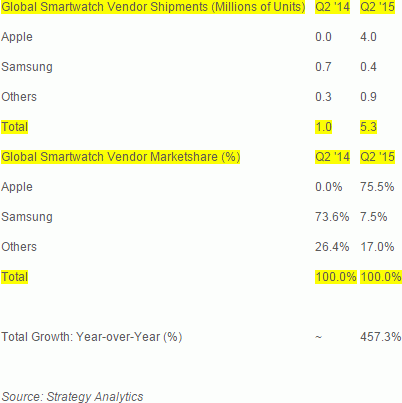 Independent experts already reported their estimates of Apple Watch sales volumes  .  According to Strategy Analytics , in the second quarter, Apple released about 4 million Smart watches, and this allowed it to take first place in the segment with 75% market share.