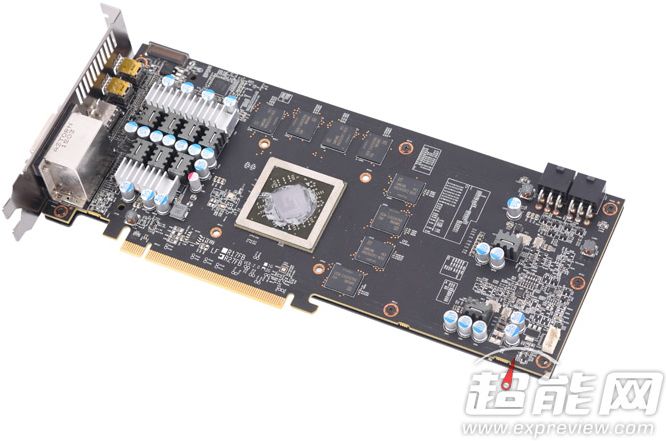 Radeon R9 370X combined 1280 stream processors, 256-bit bus, 2GB of GDDR5 memory , the default frequency of 1180/5600 MHz. On the back, in spite of current fashion, was a place for the two ports DVI, side by side with them a full-sized HDMI, and two mini-DisplayPort. Two-piece radiator cooling system has a copper base and four heatpipes. Power elements of the printed circuit board are spaced on both sides of the graphics processor, the circuit power supply subsystem is determined by the formula "7 + 1 + 1 phase."
