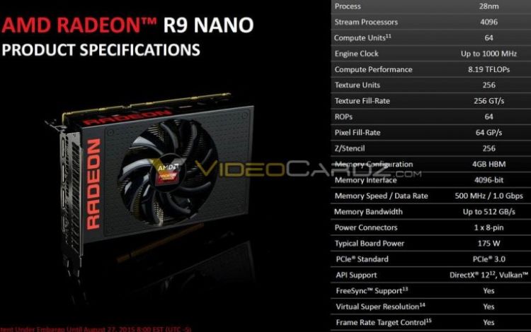 VideoCardz today published the official presentation slide from AMD, where the characteristics of Radeon R9 Nano described with precision. The card really save the configuration of functional blocks inherent Radeon R9 Fury X: a 4096 stream processors, 256 texture units and 64 samples block rasterization. In addition, the memory system is also : 4 GB of memory type HBM with 4096-bit bus, which operate at 500 MHz.