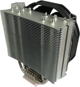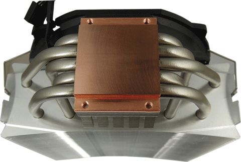The base of the cooler is made of copper.  Heat pipes are pressed against it from above a small auxiliary radiator.  A distinctive feature of this cooler is the use of the fan size 140 x 140 x 25 mm, which is mounted on brackets, and if necessary, can be replaced with fan size 120 x 120 x 25 mm.  The distance between the mounting holes on the fan of the frame size of 120 mm.