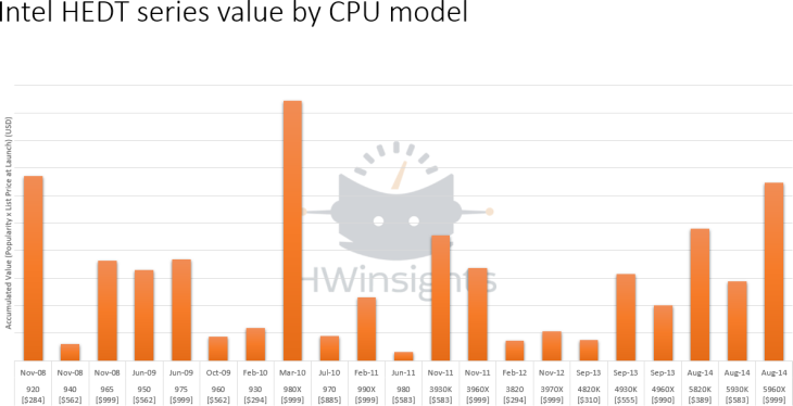 With processor Core i7-980X (Gulftown),  still remains the most popular, the situation is different - he first proposed six core enthusiasts and surpassed its predecessor by volume cache, so it gained even $ 999 per share at the time of the announcement.  Similarly, the growing popularity of  processor Core i7-5960X (Haswell-E): the only difference is that it offers by eight cores and support for four-channel DDR4.