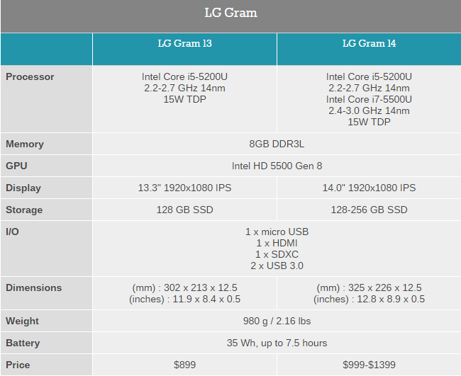 Ultrabooks, LG acquires symbolic name Gram.  True, we are talking about almost a kilogram - the mass of each model does not exceed 980 This is true for the model with 13.3-inch display, and for a model with a larger 14-inch display.  In both cases the IPS-panel with a resolution of 1920 x 1080 pixels.  Dimensions of the first case does not exceed 302 x 213 x 12.5 mm, the second - 325 x 226 x 12.5 mm.  Such a thin body can accommodate two full-size ports USB 3.0, one HDMI, slot for memory cards SDXC types and port micro-USB, which is set to the network adapter port Ethernet 10/100 Mbit / s.  Access to the wireless network adapter provides  Intel Dual Band Wireless AC-7260.