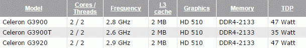 Two cores in all cases side by side with two megabytes of cache memory and the graphics system Intel HD 510. Supports dual-channel DDR4-2133 memory should be combined with support for DDR3L. The TDP value, depending on the model, is 35 or 47 watts. Celeron G3900 and Celeron G3920 one of the stores already estimated at $ 48 and $ 57, respectively, but it is only pre-orders. In the current price scale Celeron Skylake generation are $ 6 more expensive than their predecessors.