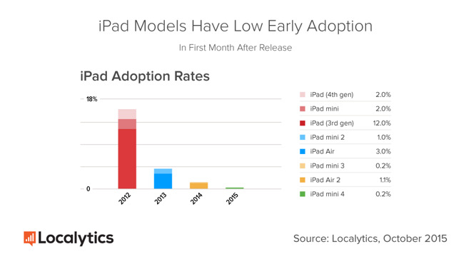 According to Localytics, in October this year, the share of second-generation iPad was 20%, making it the most popular among all generations of the existing iPad.  In second place with a share of 18% is a first iPad mini, and closes the top three with 17% iPad Air, presented two years ago.  Among the outsiders - the first iPad with 3%, iPad mini 3 2%, submitted two months ago 3 iPad mini, which accounts for only 0.3% of the total issued Apple tablets .