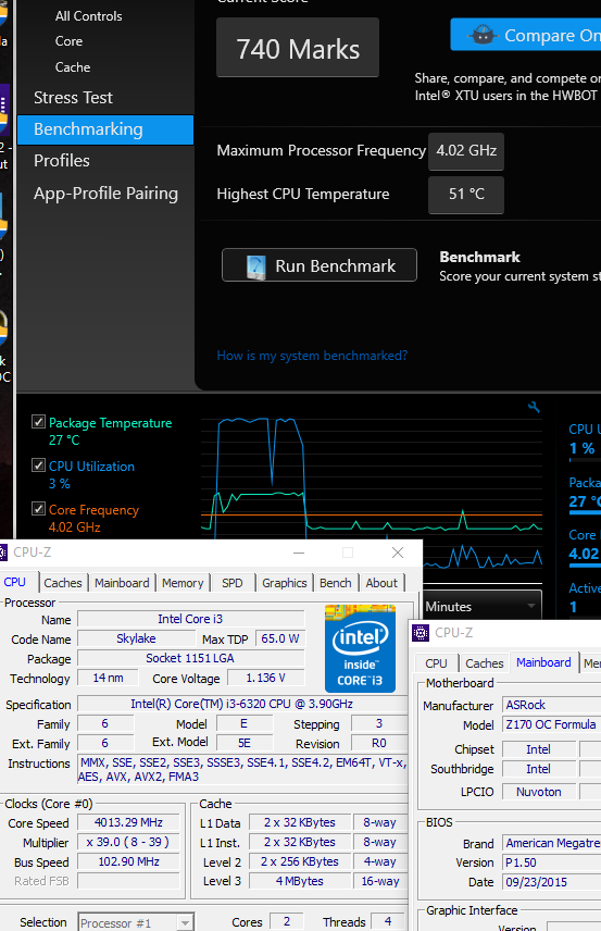 American enthusiasts L0ud_sil3nc3 managed to raise XTU best score to 740 points using the CPU Core i3-6320, overclocked to 4013 MHz (4020 MHz, according to the utility XTU).  We used the motherboard ASRock Z170 OC Formula.