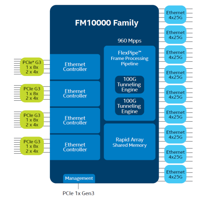Solutions family multinode network controllers FM10000 can offer support to Ethernet lines 36 with a data rate of 1 to 25 Gbit / s.  It is also possible aggregation of four lines with a capacity of 40 or 100 Gbit / s.