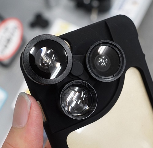 Cover is equipped with three lenses: a wide angle (with Macro), Fisheye (fish-eye) and a telephoto lens, which are intended to extend the functionality of the back camera . To change the optics used rotary mechanism. Accessory has two separate parts: the bumper black with fixed lenses on it and a transparent silicone protective case.