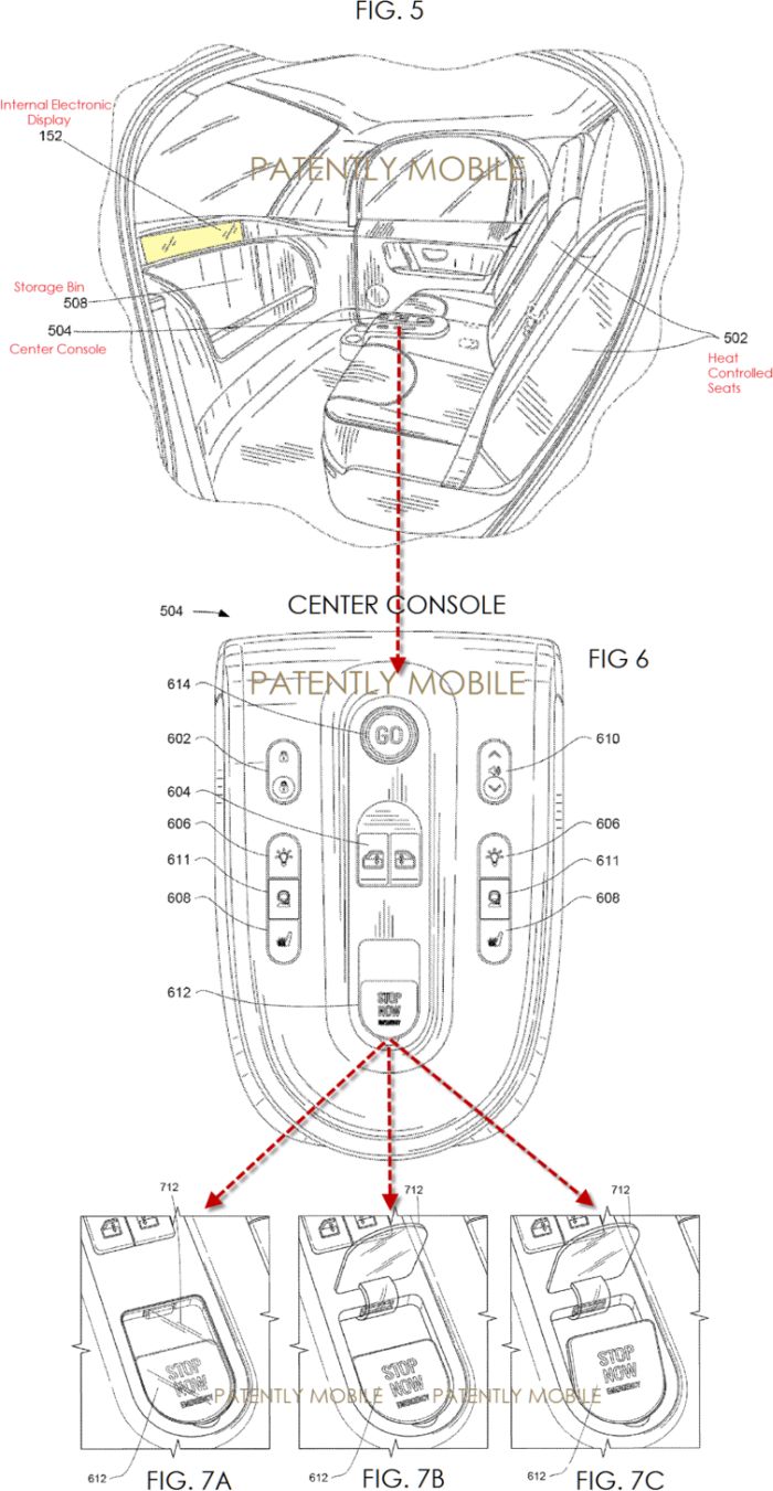 Website Patently Mobile This week published a patent image compartment and the control console of Google car.  From the description it is clear that, ideally, the corporation seeks to minimize human involvement in the management of the car .  No steering, no pedals are provided.  To define the route, the client use a smartphone with a core application, the microphone in the cabin of the car, as well as a large round button in the center console.