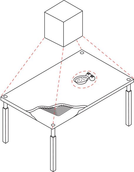 Above the table, in this case it is necessary to fix a special unit with a camera and built-in projector.  The table surface may also conceal additional devices - for example, induction heating panel for charging the product or smartphone, which is involved in the search process recipes.