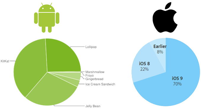 70 percents of the apple devices running on iOS 9, while Android Marshmallow occupies 0.3 of the market