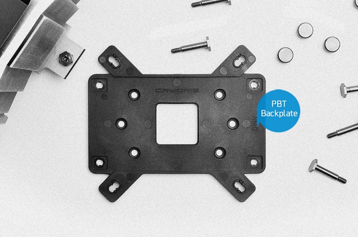 The massive cooling system CRYORIG provided with a metal reinforcing plate mounted on the back side of the motherboard, and the spring-loaded screws. The first part prevents bending of the motherboard under the weight of the radiator, the second - acts as a shock absorber and absorbs the impacts that may occur when shocks and sudden movement.