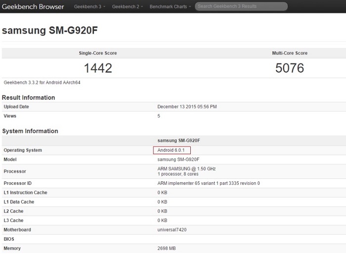 As you know, Google released a new version of the operating system Android 6.0 Marshmallow in early October, but updated was only Nexus Android One, as well as several smartphones from Motorola and LG G4. Whatever in the Geekbench benchmark appeared Samsung Galaxy S6, tested with an installed Android 6.0 Marshmallow, and Android 6.0.1. It is logical to conclude that Samsung has decided to update their devices directly to Android 6.0.1, to fix a number of bugs that were present in the base version.