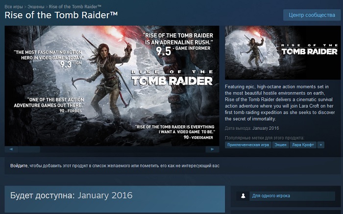 PC-version of Rise of the Tomb Raider is due out at the beginning of this year, and now, a few days ago on Steam has an official page of the game, which has the approximate release date - January 2016.