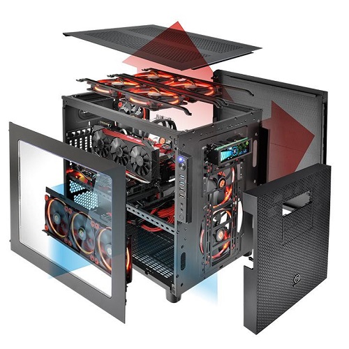 case Core X5 supports up to nineteen 120mm fans, and seven 140-mm or 200-mm three. Also, the manufacturer notes the novelty of the certificate Tt LCS, which means full compatibility with the liquid cooling system performance. Note that the case supports setup radiator liquid cooling systems and a length of 360 mm on the front panel, up to 140 mm - at the rear, up to 400 mm and two 360 mm - at the top, two 360 mm - the bottom (no BP) and 360 mm - on the side.