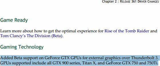 Active manufacturers of video cards and accessories at CES 2016 related to the demonstration of "external graphics", was provoked not only by the growing popularity of gaming notebooks but also by the distribution of high-speed interfaces such as USB 3.1 and Thunderbolt. As it turns out, NVIDIA is ready for the ground for external graphics cards outside the system unit  , which driver version 361.75 realized preliminary support graphics cards that work with Thunderbolt interface 3.