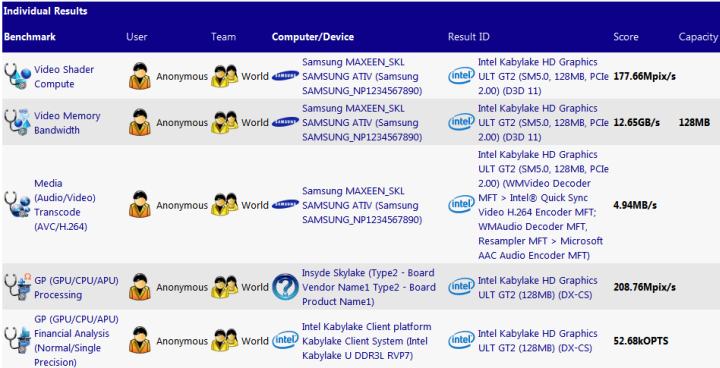 Notebooks based on Intel Kaby Lake in SiSoftware database
