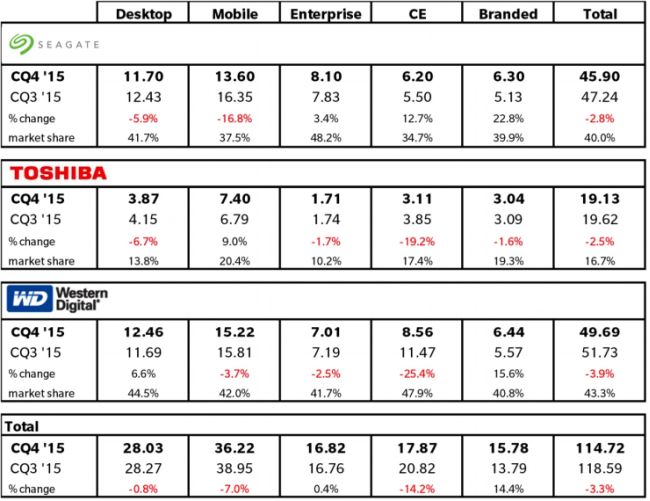 In the desktop segment, a slight progress compared to the third quarter can speak only Western Digital Corporation.  Seagate is inferior both in the number of sold hard drive, and on financial performance.  According to TrendFOCUS, in the fourth quarter the market hard drives has shrunk by 3.3% compared with the previous quarter, most sales used in consumer electronics and laptops.