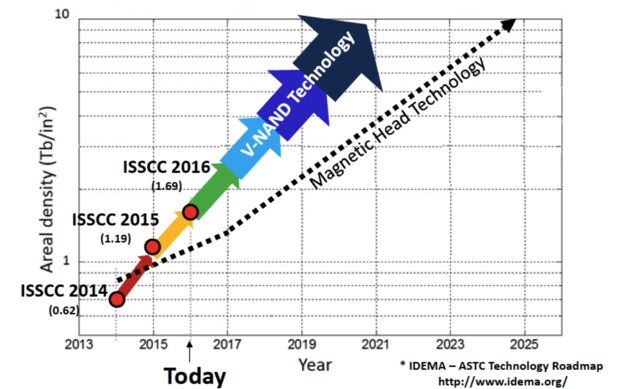 According to Samsung, in the last year SSDs caught density recording on magnetic hard drives platters - crossing occurred at the level of less than 1 terabit per square inch, and now SSD already provide a recording density of 1.69 terabits per square inch . This is achieved through the use of memory-type 3D NAND. Company Micron announced its ability to create drives with a recording density of 2.77 terabits per square inch. The most capacious hard drives are now providing the recording density of up to 1.3 terabits per square inch. However, most commercially supplied HDD, this figure does not exceed the 850 gigabits per square inch.