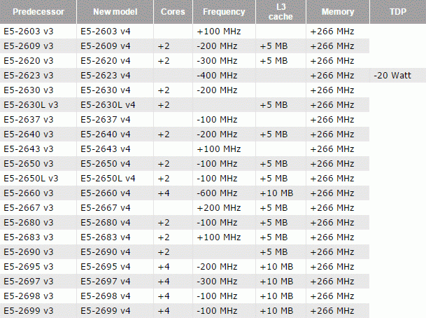 A comparison was made with the characteristics of precursors. In most cases we can talk about increasing the number of cores, clock speeds but at the same time reduced to 100-200 MHz. cache volume increased by 5 or 10 MB, and the memory operating frequency in all cases has grown by 266 MHz.