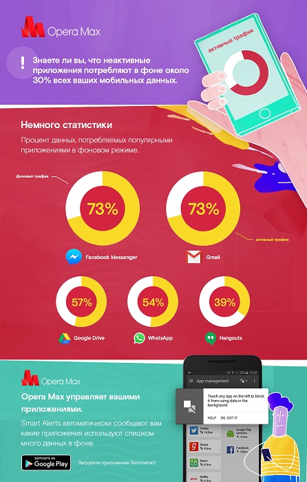 Opera Company shared interesting statistics. According to them, more than 30% of mobile internet traffic used by applications that are in the background. In other words, it is the traffic which is used at the time when the application itself is minimized. Most often, this data update ad units social networking applications and news.
