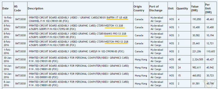 Database of Indian customs data brought several names and variations of graphics cards, AMD. Once again, we heard about the GPU Baffin and learned about the existence of products under the code names Banks and Weston.