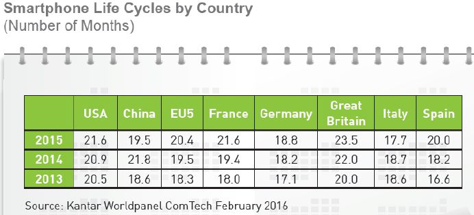 The life cycles of smartphones also increased, their duration in months can be seen in the table. Sales value above $ 500 smartphones are growing slowly: by 9% in the US and 6% in the five largest European countries. Among the buyers of the new smartphone devices in this price category are selected 48% of Americans and 27% of Europeans. Approximately half of the respondents in the US and Europe is planning to buy a new smartphone in the next 12 months, those among the Chinese is only 28%.