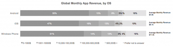 Thus, according to InMobi , the average fee application developer for the Microsoft operating system is 11 to $ 400 per month. In comparison, for the creation of programs for iOS «creator" will receive about $ 8, 100 for Android - 4900 $ per month. Higher price tags for the work due to the very low popularity of Windows Phone and weaker competition among developers, but everything can change with the advent of universal applications on this platform, as well as due to the new concept of easier porting