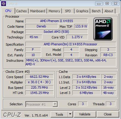 45nm AMD Deneb family not so often fall into the statistics records of extreme overclocking , but they boast the ability to reach under liquid nitrogen frequencies over 6.5 GHz. So a few days ago the Hungarian overclocker SubaruWRC overclocked the Phenom II X4 955 BE's three core mode to 6623 MHz. For cooling the processor was used liquid nitrogen.