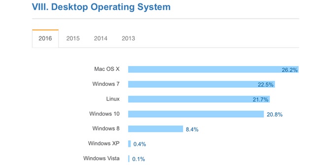 As specified by the initiators of the study, in the past year, OS X and Linux distributions ahead, becoming the second most in demand among developers, which means that by  2017 Windows will use less than 50% of developers.  Also, representatives of Stack Overflow note that their work can be considered objective since the survey was conducted among a large number of respondents from around the world.