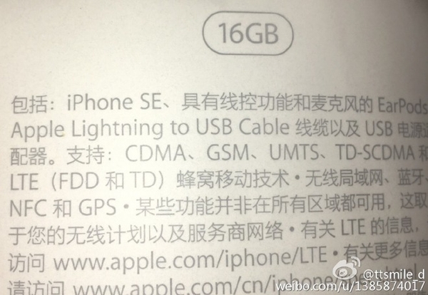 A Chinese source, shows a fragment of the shipping box for the new 4-inch Apple smartphone, indicating its name, the volume of internal memory supplied.  The smartphone will be called iPhone SE and will be available in 16-gigabyte version.  It will get support for NFC, GSM, CDMA, LTE and NFC and will be bundled with a charger with USB-cable for charging and syncing, and proprietary headphones Apple EarPods.
