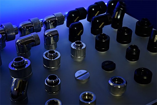 Eiszapfen includes straight and angled compression fittings for PVC pipes 13/10 mm, 16/10 mm and 19/13 mm (outside / inside diameter). To connect the rigid tube, for example, acrylic, Alphacool proposed fittings 13 and diameter 16 mm. They were presented 45- and 90-degree angle adapters, as well as 10- and 20-mm extension, and T-shaped connectors. Note that all the new items are the most popular thread G 1/4.