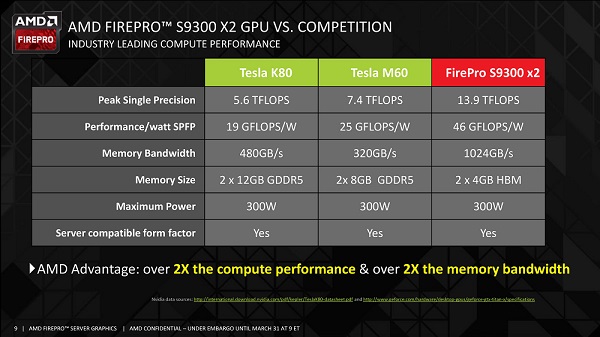 FirePro S9300 X2 is designed for single-precision calculations, which are widely used in various fields of science.  The performance of 13.9 teraflops in the calculations of single precision and 0.8 teraflops of double-precision operations.  Although performance trends lower than the Radeon Pro Duo, it is still far ahead of its main competitor - NVIDIA Tesla K80 and Tesla M60.