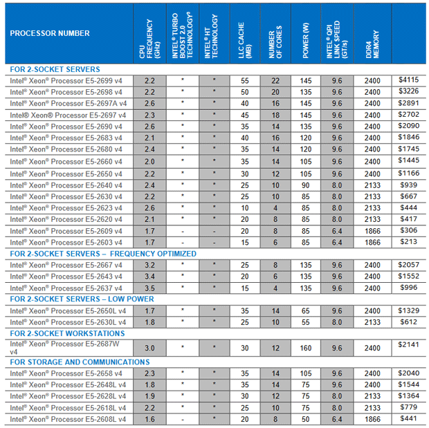 The question price starts at $ 212 and ends at around $ 4115.  Among the models can also detect a single processor for two-socket workstations - 12-core model E5-2687W v4.  The value of the maximum consumption of the model for this category of products  is 160 watts.  Price - $ 2141.  But the operating frequency reaches quite good value 3 GHz.