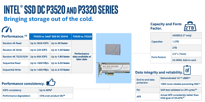 Performance Intel SSD DC P3320 and P3520 SSDs in reading random blocks reaches 365,000 IOPS, and  recording - 22,000 IOPS.  sequential read speeds of up to 1600 MB / s and write - 1400 MB / s.  Although Intel has not yet sounded the cost of these drives, it will be relatively low.