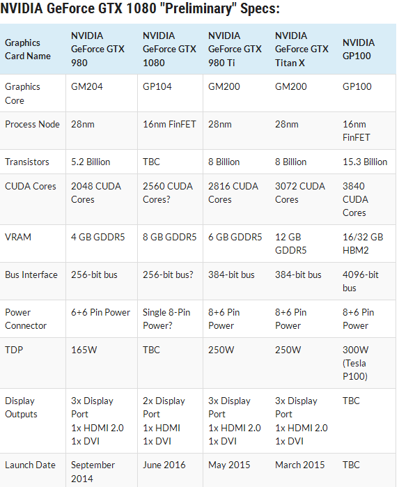 If you believe the leak area GPU GP104 chip is 300 square meters.  mm, which is slightly smaller than that of GPU GM204 - 398 square meters.  mm, which contains 5.2 billion. transistors and serves as a base for the GeForce GTX 980 and GTX 970. Presumably, GP104 will carry 7 billion transistors.  Taking into account new knowledge about the architecture and composition of the GPU GP100 can be relatively accurately predict the configuration of the new GPU NVIDIA.