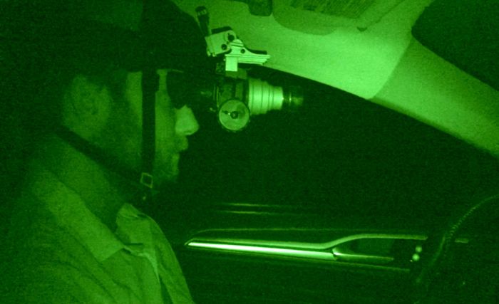 The behavior of the prototype at the site testers monitored using night vision devices.  The purpose of the experiment - to prove that the equipment allows the vehicle to navigate the terrain with the helplessness  cameras in complete darkness or low visibility.