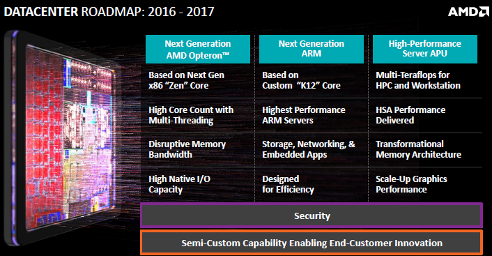 In the server segment in 2016-2017 are promised the Opteron processors with x86-based architecture, Zen, with ARM-compatible K12 architecture that AMD is developing independently under license.