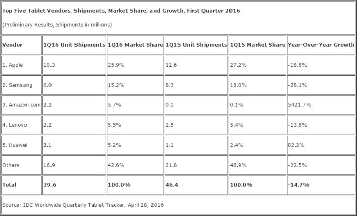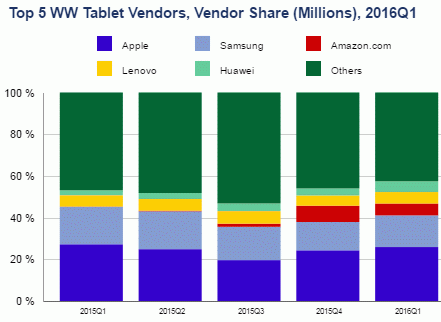 The market leader remains Apple's tablet , though interest in the iPad has been steadily declining, despite the emergence of new models and the revision of old price  .  Analysts believe that the iPad buyers -  mainly those who change the old Apple tablet to a new one.  Samsung for the year decreased sales volume of tablets by 28.1%, but remained in second place.  Amazon sells mostly good cheapest tablets.