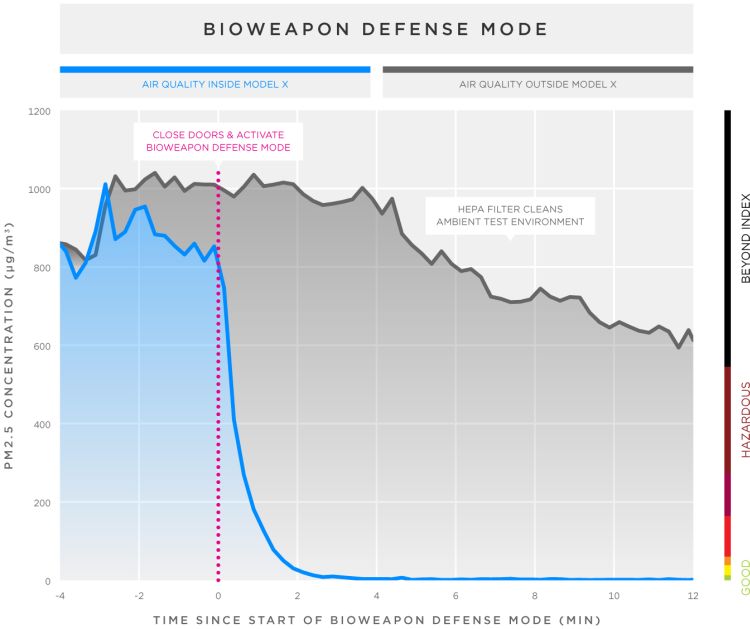 At least in our own laboratory Tesla Motors was able to hold an interesting experiment.  The crossover Model X with a large HEPA filter interior type   and defense system from that same "biological weapon" was placed under the inflatable dome.  The testers were seated in an electric gas masks, then under the dome was filed polluted air, and electric door closed after .